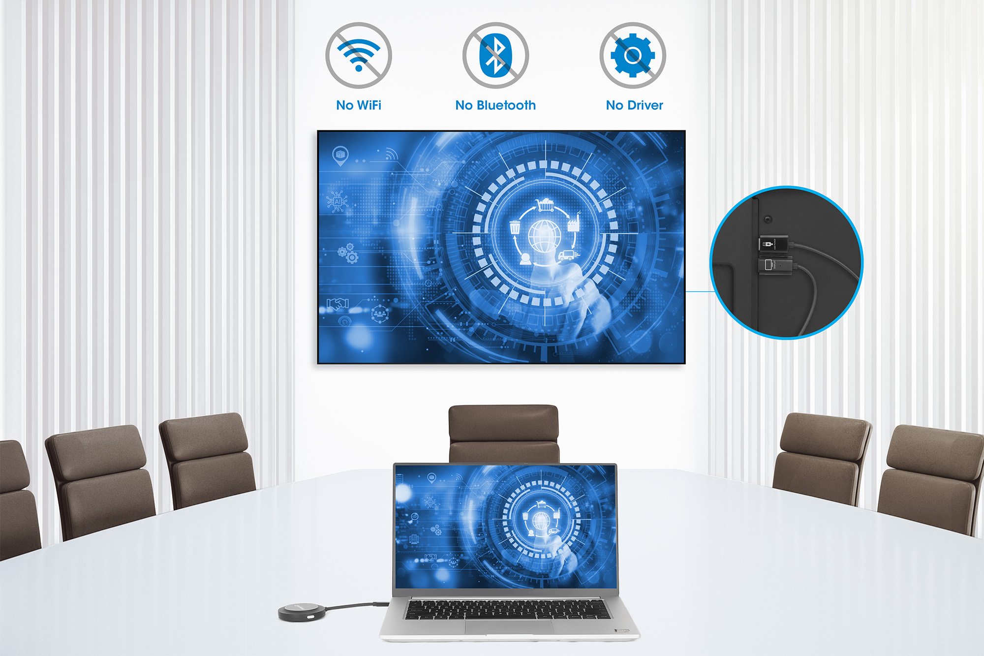 Kein WLAN, keine Treiber, keine Software erforderlich. Der HDMI-Empfänger wird direkt am Display angeschlossen, USB-A dient zur Stromversorgung.