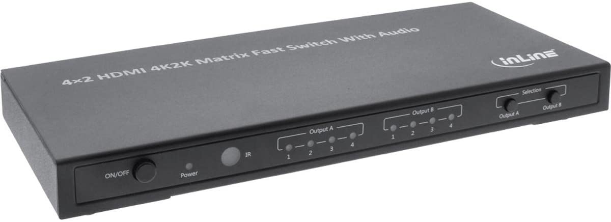 Der InLine® HDMI-MATRIX-SWITCH leitet High-Definition-Video in mehreren Auflösungen von bis zu 4K2K und digitales Mehrkanalaudio aus den vier HDMI-Quellen an zwei Display-Geräte weiter. Zwei Ausgänge geben Ihnen die Auswahlmöglichkeiten von High-Definition-Audio- und Video-Signalen an bis zu zwei Displays. Jede Art von 4-zu-2-Matrix-Umschaltung bietet höchste Flexibilität für bestehende integrierte Systeme. Damit entfällt der Aufwand ständigen Umsteckens der Quellen an ein Display, das nur mit einem Eingang ausgestattet ist. Jede Quelle ist zu jeder Zeit von jedem Display-Gerät aus mit einer IR-Fernbedienung zugänglich.