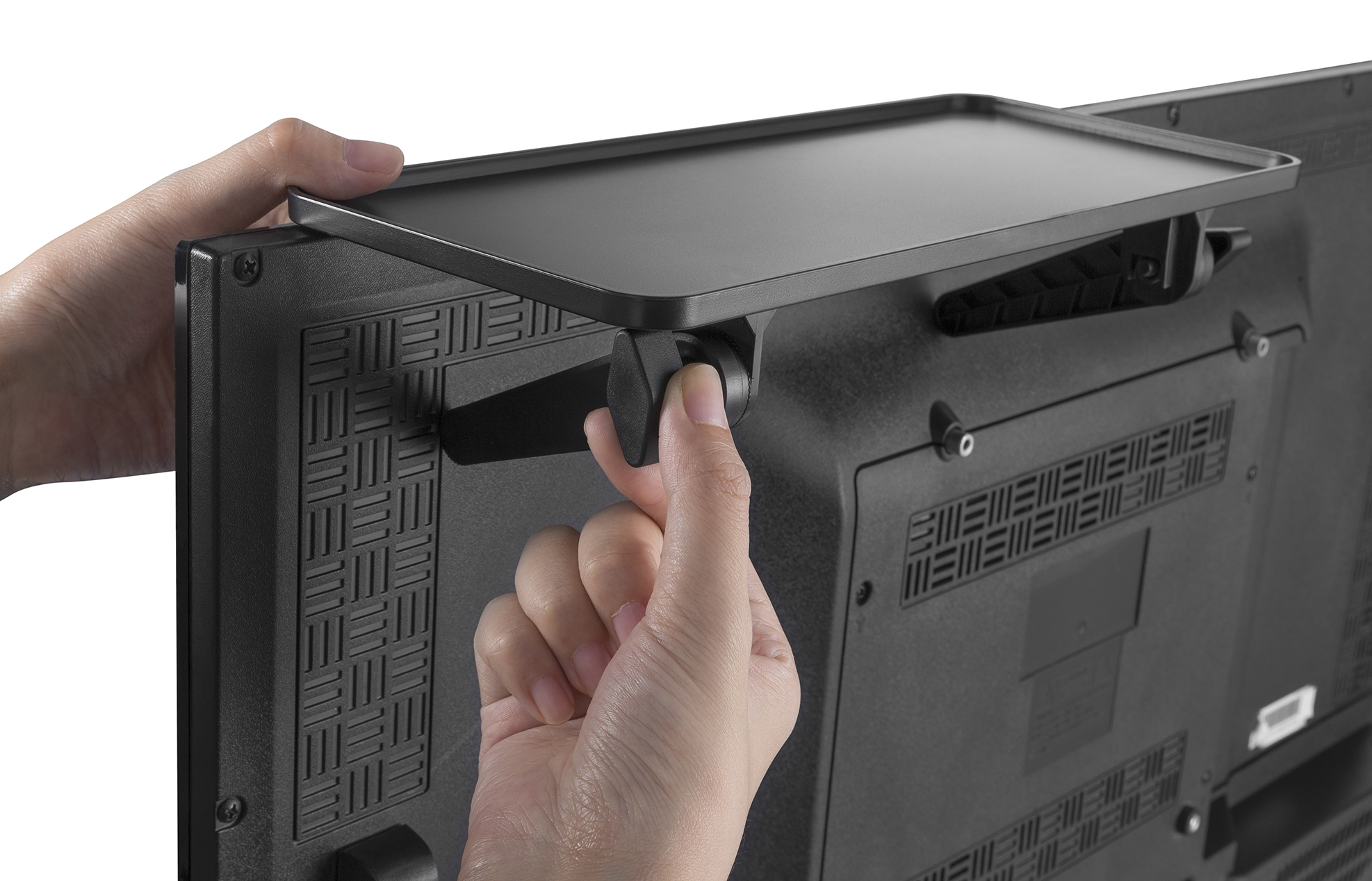 Die Halterung passt sich den meisten Fernsehgeräten an: Ein praktischer Knopf verriegelt das Bein.