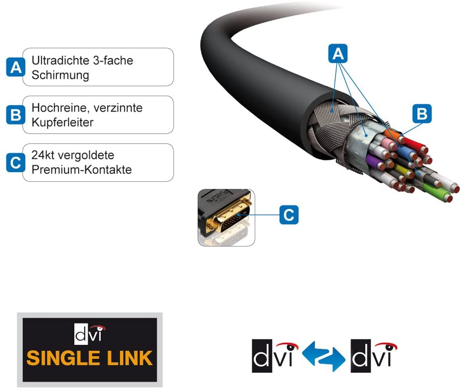 Die hochpräzisiert hergestellten und perfekt sitzenden Stecker mit 24 Karat goldbeschichteten Kontakten garantieren eine optimale Signalübertragung und dauerhaft zuverlässige Funktionsfähigkeit. Unsere DVI Kabel wurden für den professionellen Gebrauch und auf extreme Biegung getestet.