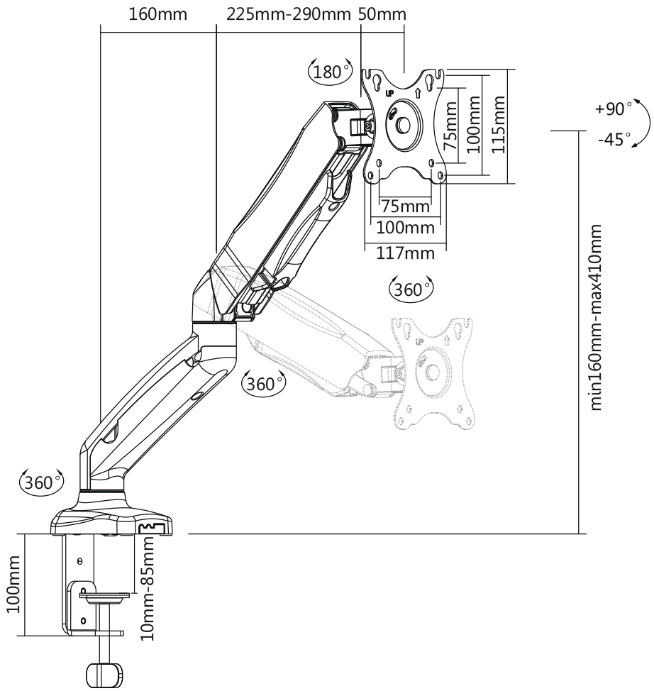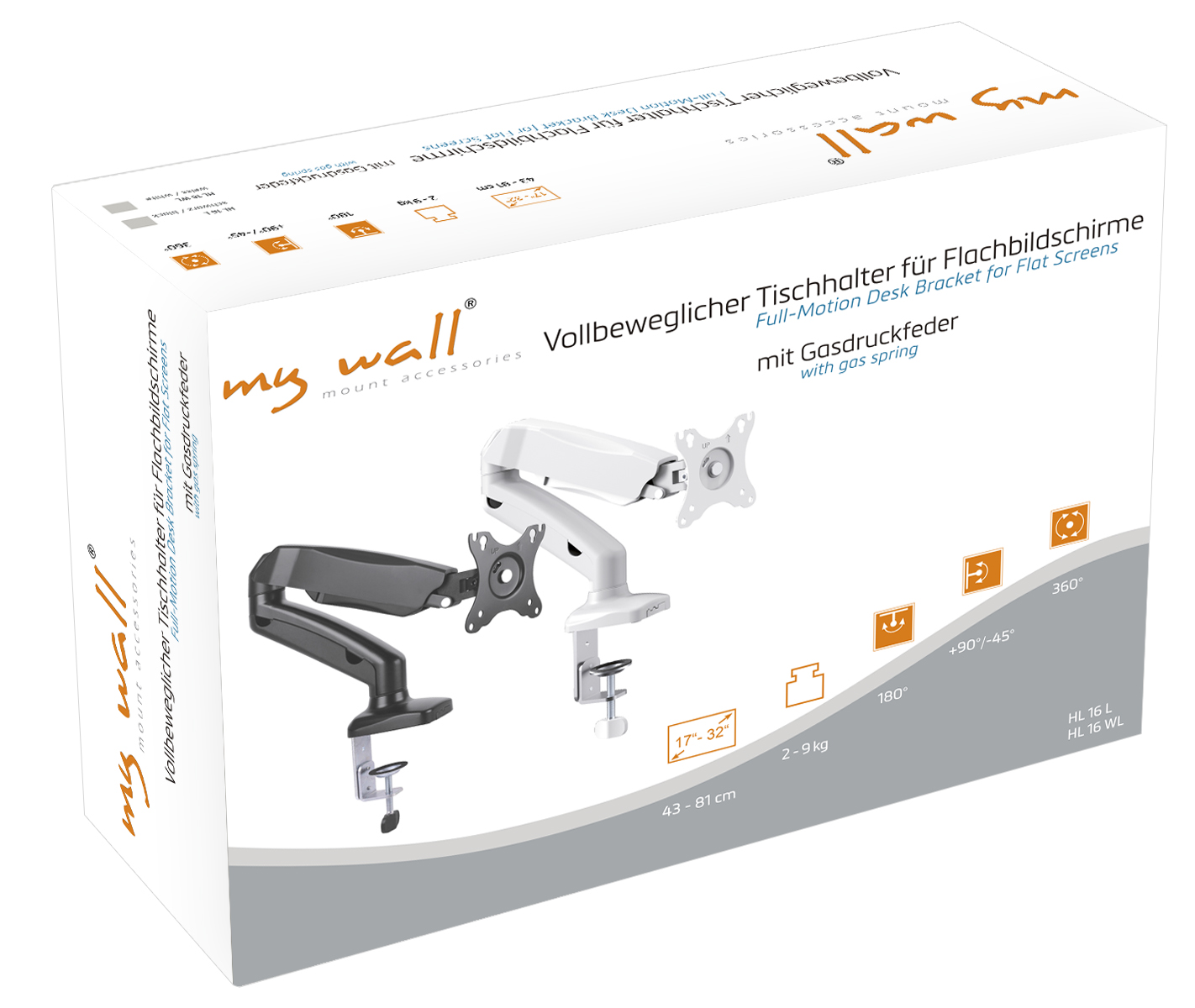 Der robuste Aluminium-Gasdruckfeder-Tischhalter passt für Monitore von 17“ - 32“ und trägt bis zu 9 kg,