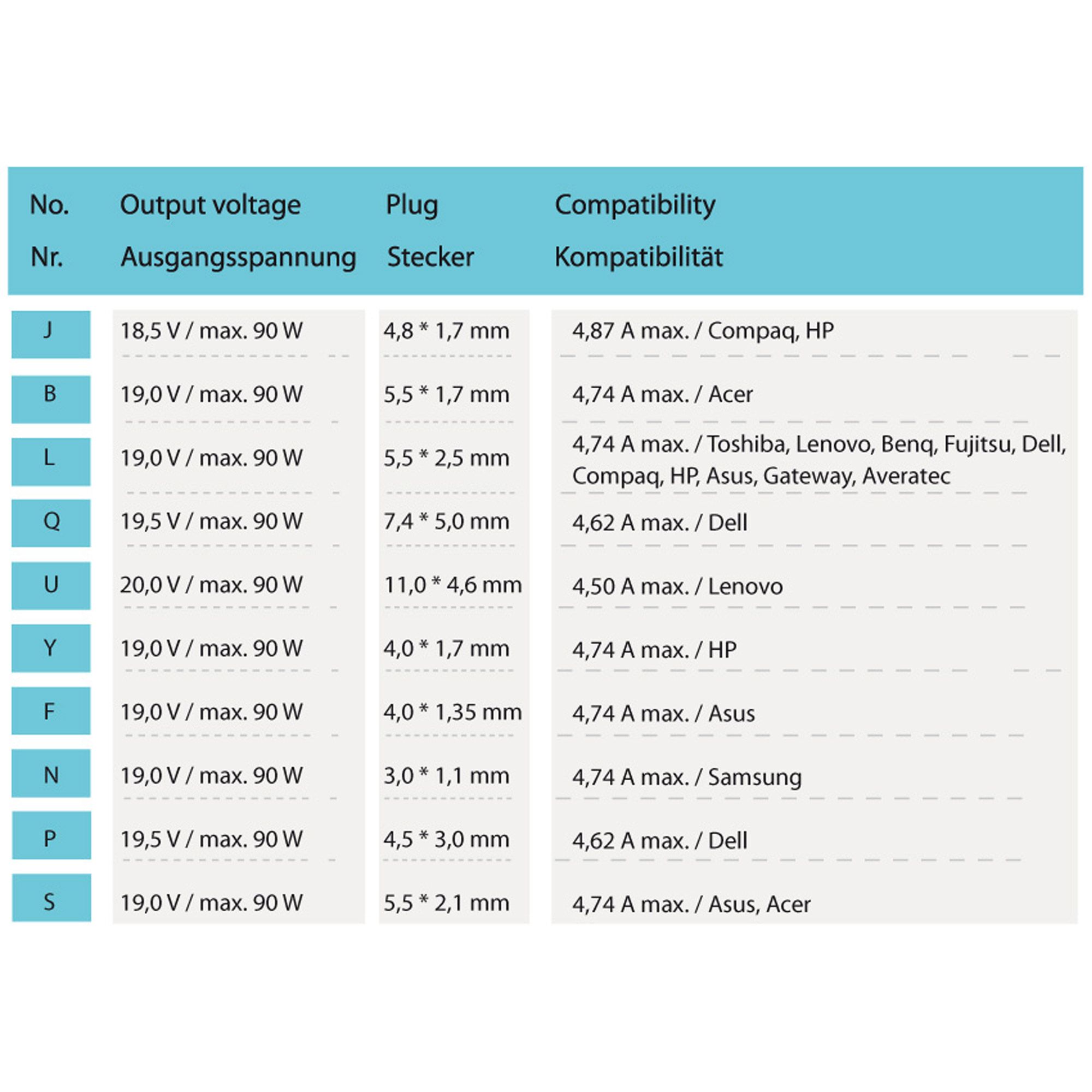 Durch mehrere austauschbare Notebook-Adapterstecker kann das Netzteil mit vielen gängigen Notebook-Anschlüssen verwendet werden.