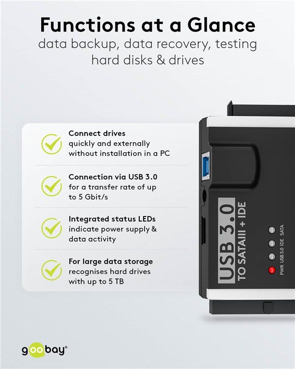 Der SATA-USB-Adapter ist perfekt zur Datensicherung, Datenrettung oder zum Testen von Festplatten und Laufwerken geeignet