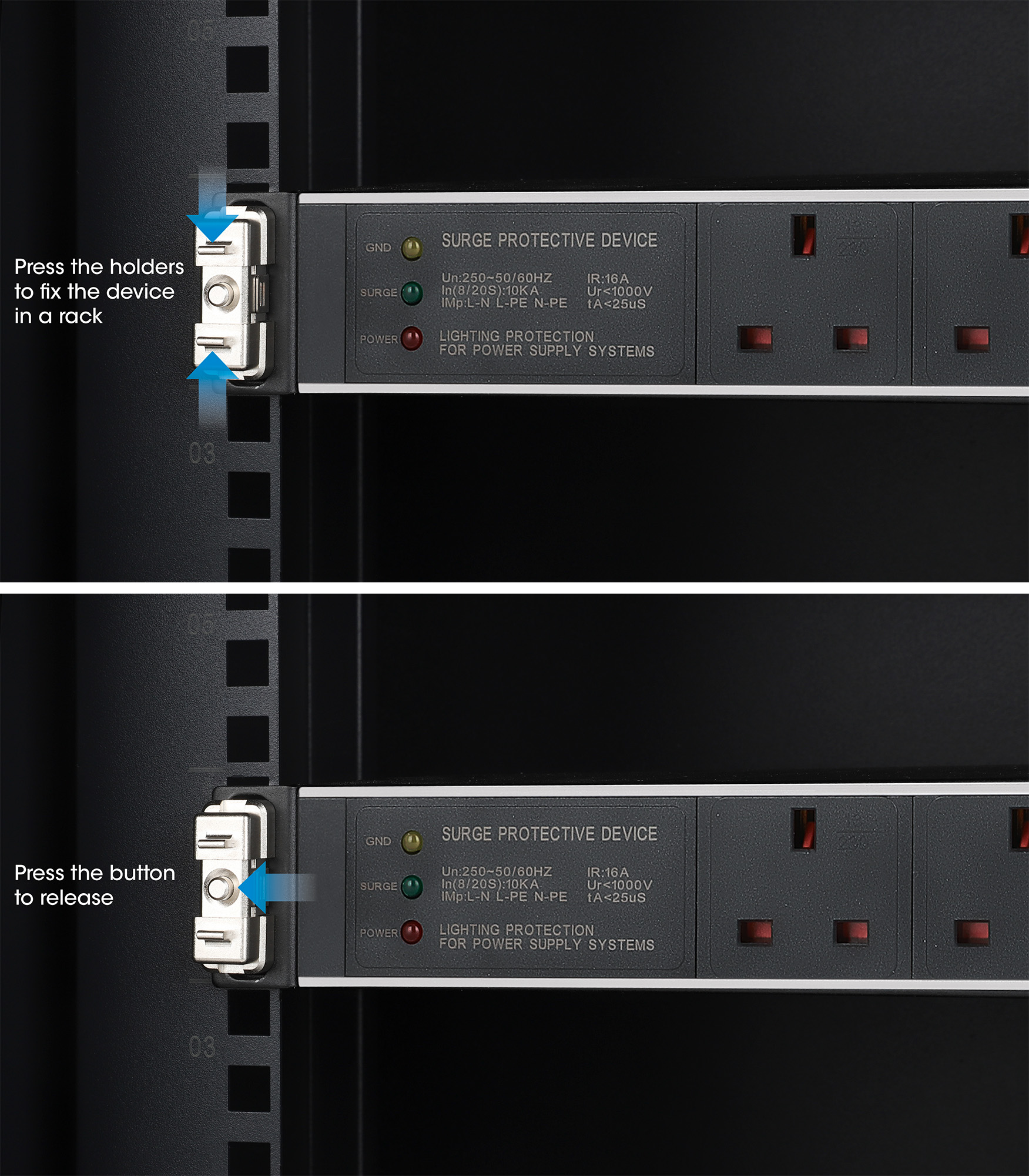 - Er erleichtert die werkzeugfreie Montage von Server- und Netzwerkzubehör im Rack.