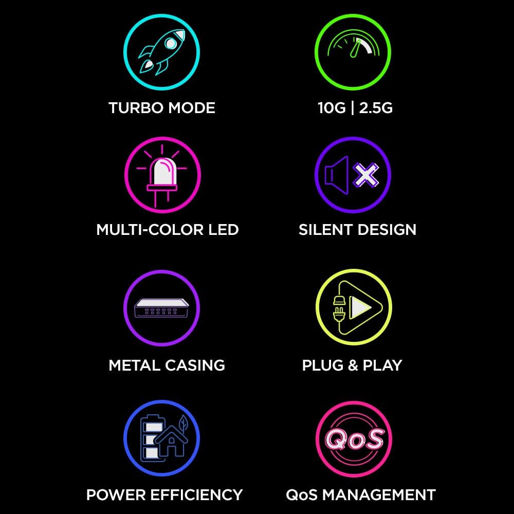 Profitieren Sie von einem ultraschnellen 10-Gigabit-Uplink, fünf 2,5-Gigabit-Ports, einem Turbo-Modus für portbasierte QoS-Priorisierung sowie mehrfarbigen LED-Leuchten. So beseitigen Sie Bottlenecks in Ihrem Netzwerk und sorgen für optimale Leistung und maximalen Durchsatz.
