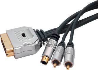 Home Cinema Scartkabel, High-End, 1x verchromter Metall-Scartstecker auf 1x Stereo-Audio-Cinch-Metallstecker + 1x SVHS-Metallstecker, 24K vergoldete Kontakte, trittfest, angespritzer Knickschutz, Audio- und Videoleitungen zusätzlich geschirmt, sauerstofffreies Kupfer, alle Leitungen doppelt geschirmt.