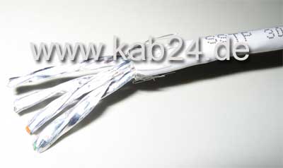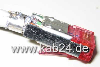 In unserem Beispiel verwenden wir PIMF-Kabel, dessen Twistet-Pair Paare nochmals einzeln mit einem Aluminiumschirm ummantelt sind. Auch dieser Schrim wird so abgeschnitten, dass dieser ca. 5-6mm umgeklappt wird.