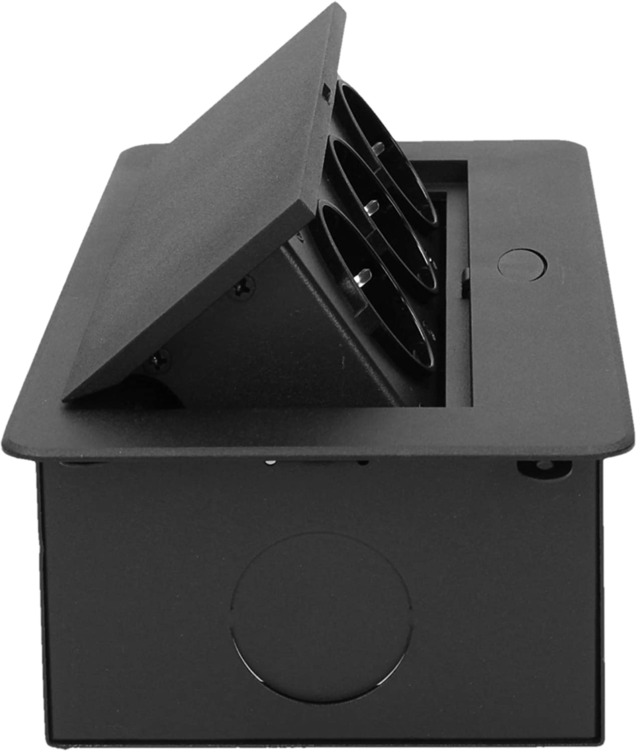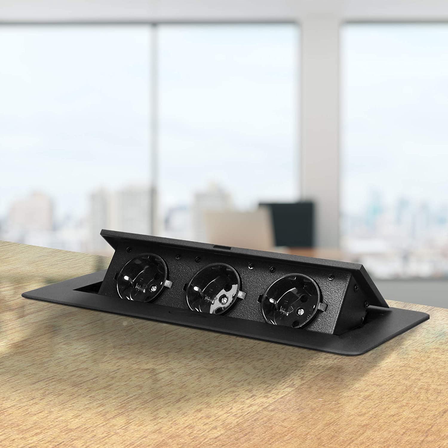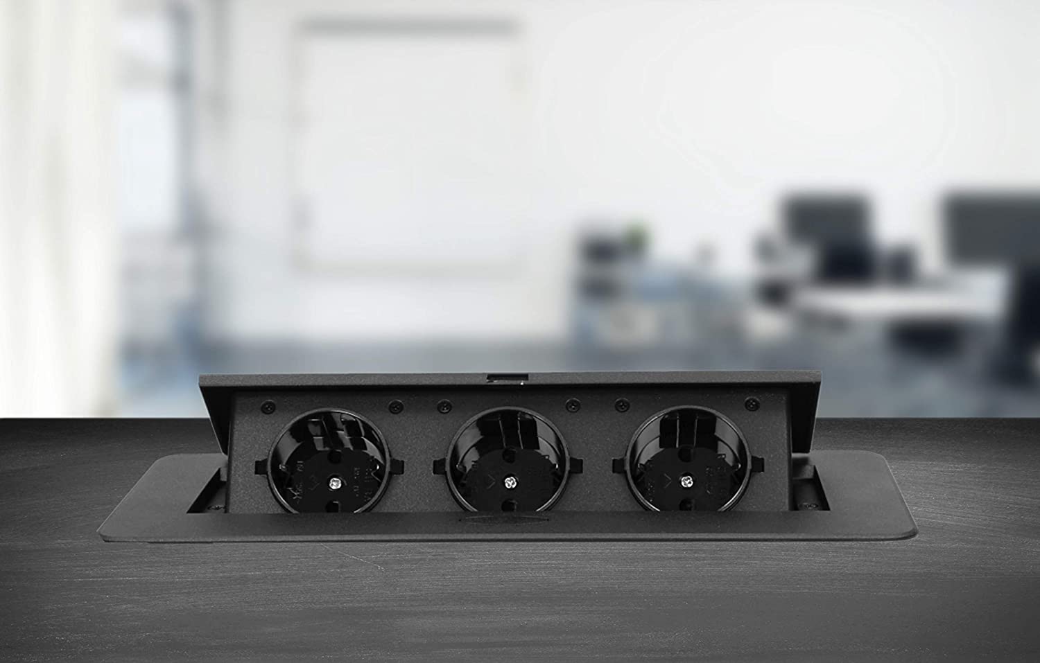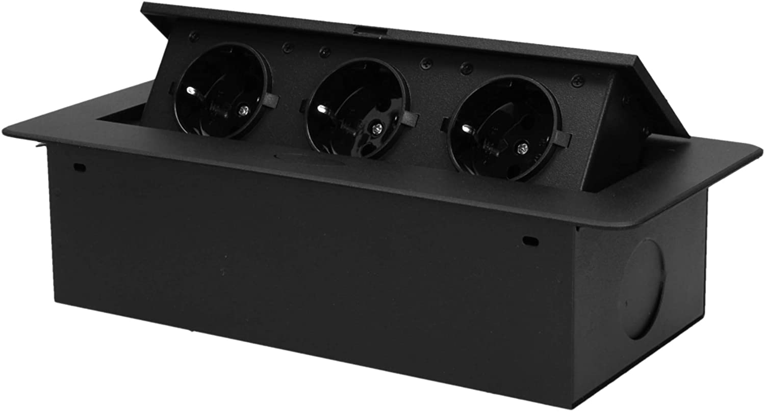 Ein Satz von drei Schutzkontaktsteckdosen mit Erdung und Membranen für Stromleitungen in einem in der Tischplatte versteckbaren Gehäuse. Das Gerät ist für den Einbau in Konferenztischen, Arbeitsplatten von Büro- und Küchenmöbeln geeignet. Ausgestattet mit einem Kabel mit einer Länge von 1,5 m. Der Präzisionsmechanismus schiebt die Steckdosenleiste automatisch nach dem Drücken des Gehäuses heraus.