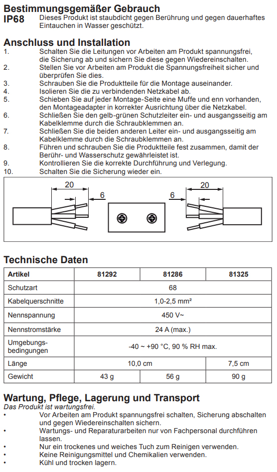 geeignet für Kabel mit 1,0 bis 2,5 mm² Querschnitt