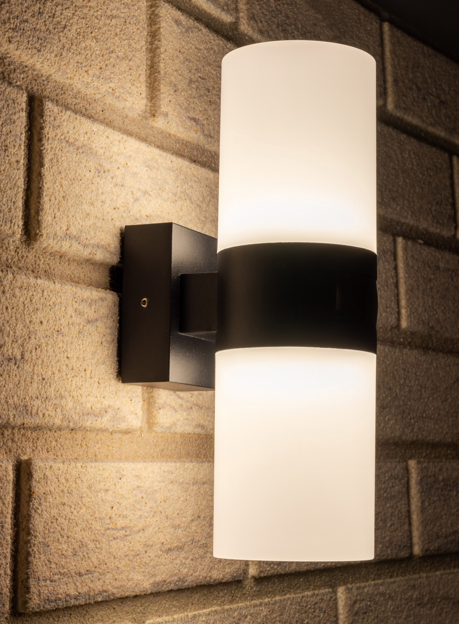 Runde Wandleuchte mit integriertem PIR-Bewegungsmelder. IP65 - ideal für Hauseingang, Terrasse und als Wegleuchte.