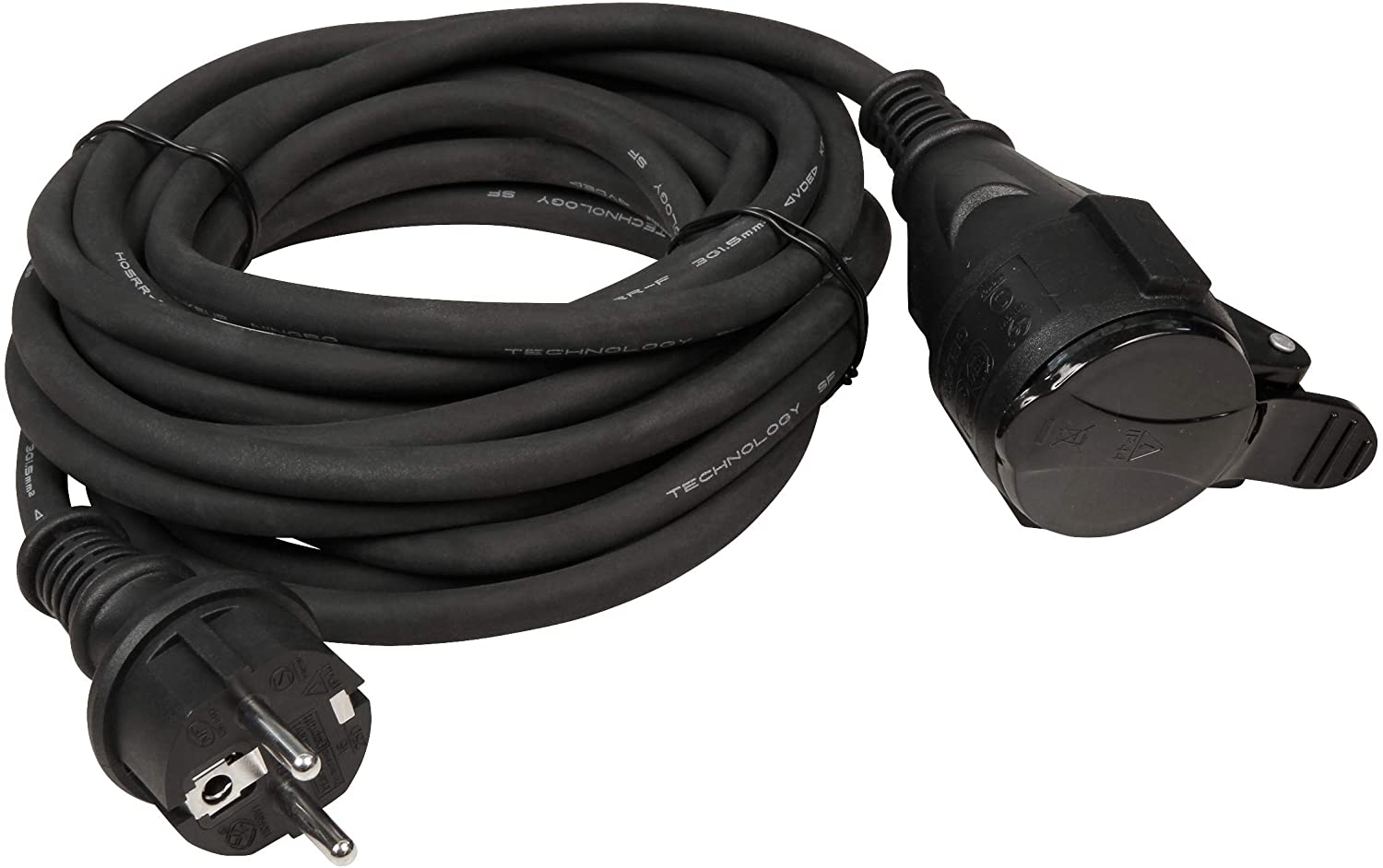 Stromverlängerungskabel aus einer schweren Gummischlauchleitung mit Schutzkappe