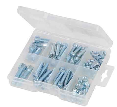 Verzinkt für Korrosionsbeständigkeit. Kleine zylinderförmige Köpfe mit hohen vertikalen Seiten. Enthält sortierte Größen von M5 x 20 bis M8 x 30 mm. Lieferung im praktischen Fächerkasten.