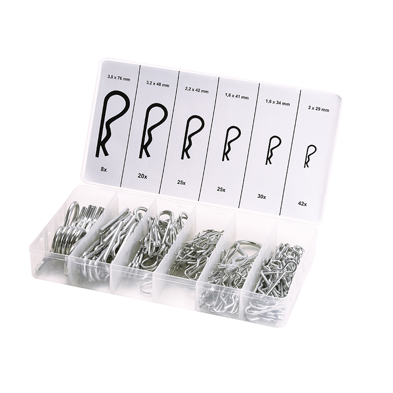 150-teiliges Federstecker/Splinte Sortiment in stabiler Kunststoffsortimentsbox. Inhalt: 42 Stück 2 x 29 mm, 30 Stück 1,6 x 34 mm, 25 Stück 1,6 x 41 mm, 25 Stück 2,2 x 42 mm, 20 Stück 3,2 x 38 mm, 8 Stück 3,8 x 76 mm. Metall verzinkt.